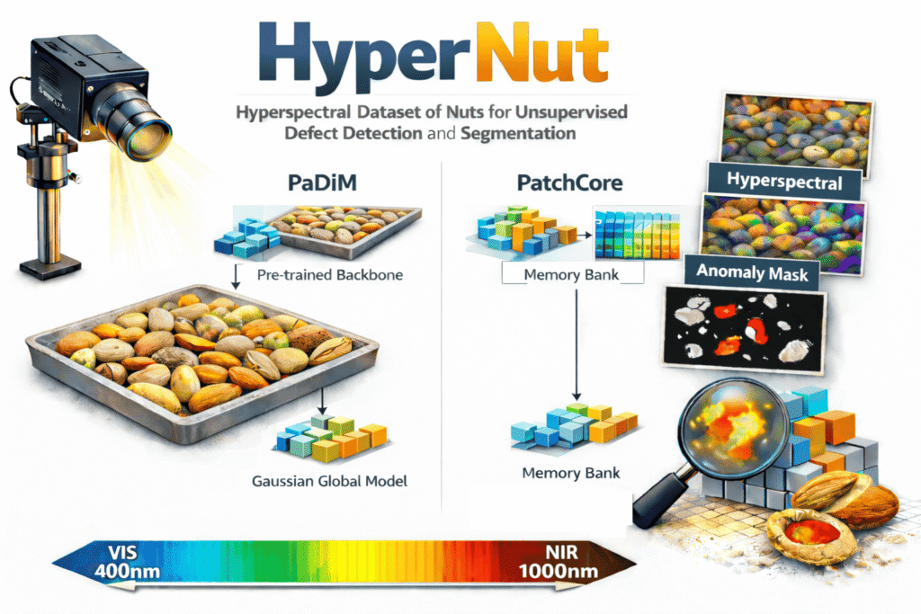 HyperNut presents a VIS–NIR hyperspectral nut dataset built to enable unsupervised defect detection and segmentation.