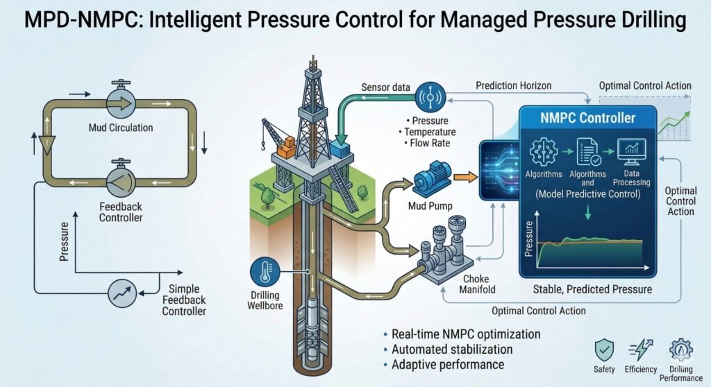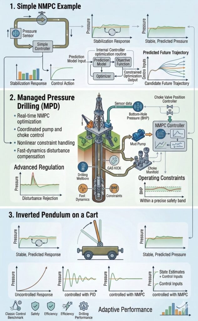 An industrial application where NMPC regulates bottom-hole pressure (BHP) in drilling, combating fast dynamics, disturbances like gas kicks, and safety constraints.
