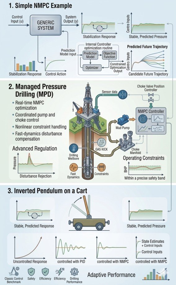 In real-world dynamic systems, from drilling processes to robotics and process control, operating safely and efficiently under constraints and disturbances is a core challenge. Traditional controllers like PID often struggle with nonlinear dynamics, large disturbances, and hard operational bounds. Nonlinear Model Predictive Control (NMPC) overcomes these limitations by using system models to predict future behavior and compute optimal control actions in real time.