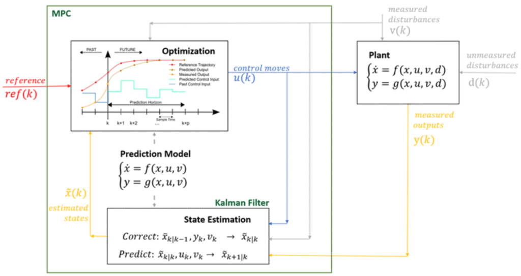 Model Predictive Control (MPC) uses a mathematical model of a system to forecast future states and optimize control inputs over a moving time horizon. Unlike classic reactive controllers, NMPC actively uses these predictions to anticipate changes and adjust actions before violations occur — making it especially useful for:
